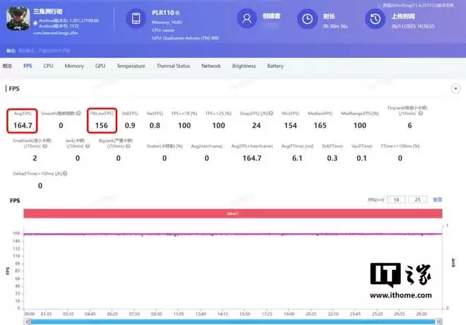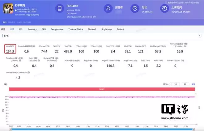 开一局匹配,28 分钟后游戏对战结束,游戏平均帧数来到了 164 帧,性能狗(PerfDog)的帧率曲线依旧是非常稳的直线,相比 120 帧显然更加丝滑流畅,连开枪射击的命中率都有所提升。
