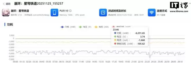 功耗方面,游戏的平均功耗达到了 5.5W,相比 60 帧下主流旗舰手机 4.2W-4.3W 的平均功耗,高出了大概 1.2-1.3W 的水平,这里面既有 120 帧插帧带来的功耗增加,也有《逆水寒手游》新地图的特效所带来的功耗压力,要知道实测中我们是全程开启光追和写实光影模式的。