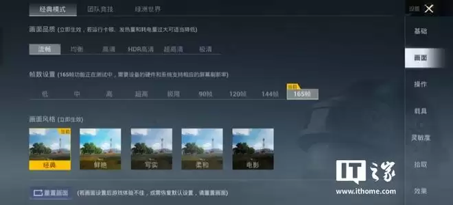 接下来是这次首发适配 165 帧的《和平精英》,进入游戏后设置菜单中直接能够看到 165 帧的选项。