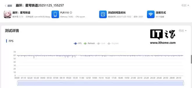 接着我们看看重度负载手游又是怎样的表现,依旧拿《崩坏:星穹铁道》来举例,一加 Ace 6T 已经适配了 972P 的高分辨率,我们在游戏助手中选择“高分辨率”进行开启,并在游戏设置中将所有画质选项调到最高,选择 60 帧和普通模式(Vulkan),然后在「黄金的时刻」地图进行 30 分钟的跑图测试。