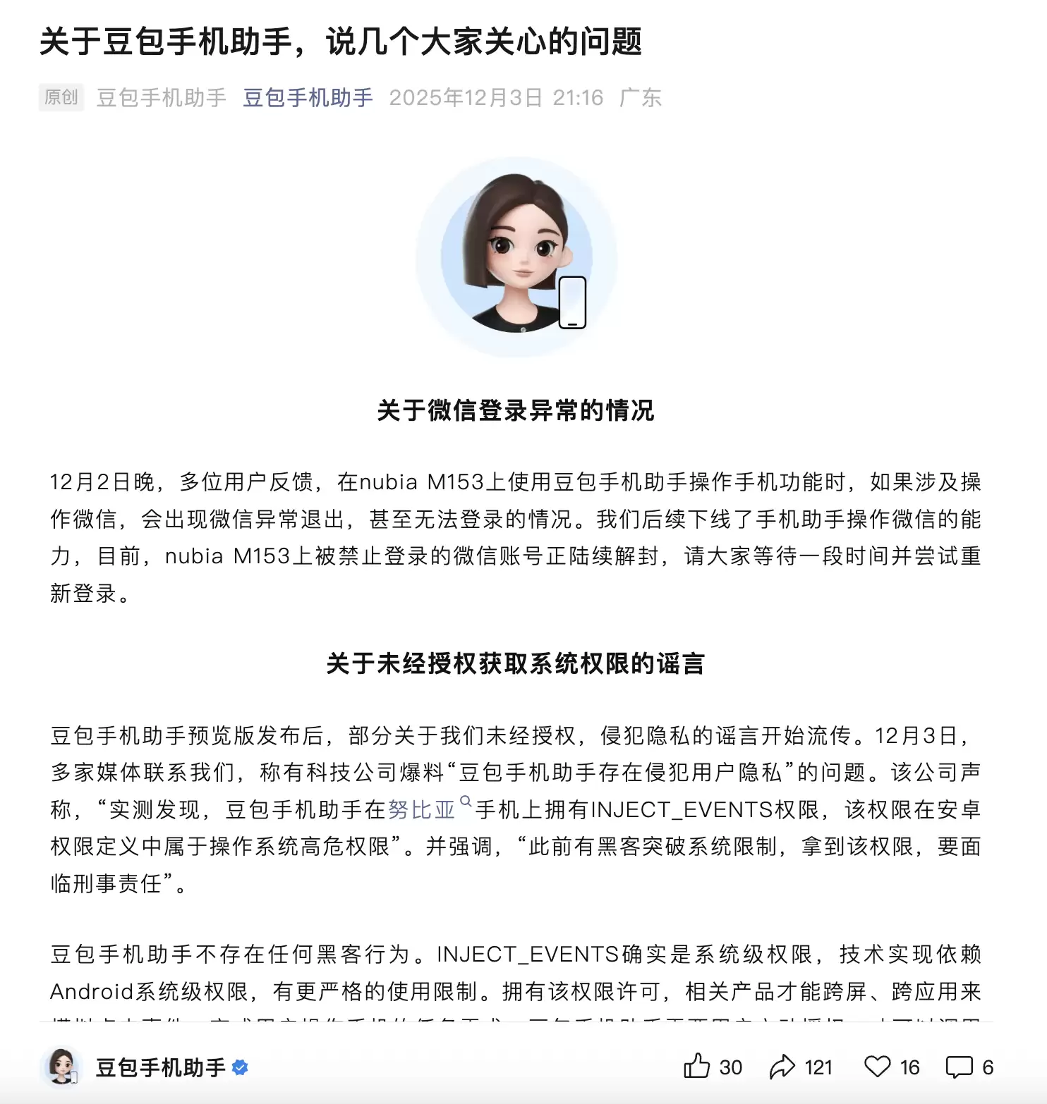 12月3日晚间,豆包手机助手运营团队发布公告,针对近期用户普遍关心的微信登录异常等问题作出说明。