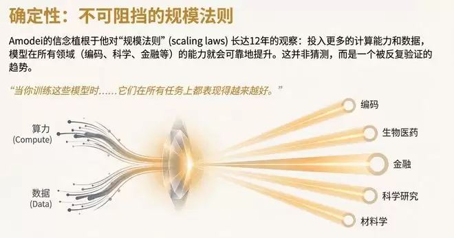 技术账目清晰可算:阿莫代伊坦言自己“内心非常踏实”,根源在于他是最早系统性记录AI扩展定律(Scaling Laws)的研究者之一。该定律的核心简明而强大:投入更多算力与数据,辅以微调,模型能力就会持续跃进。