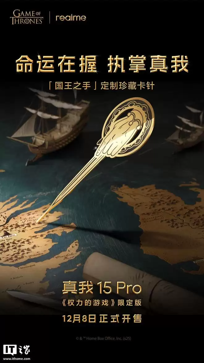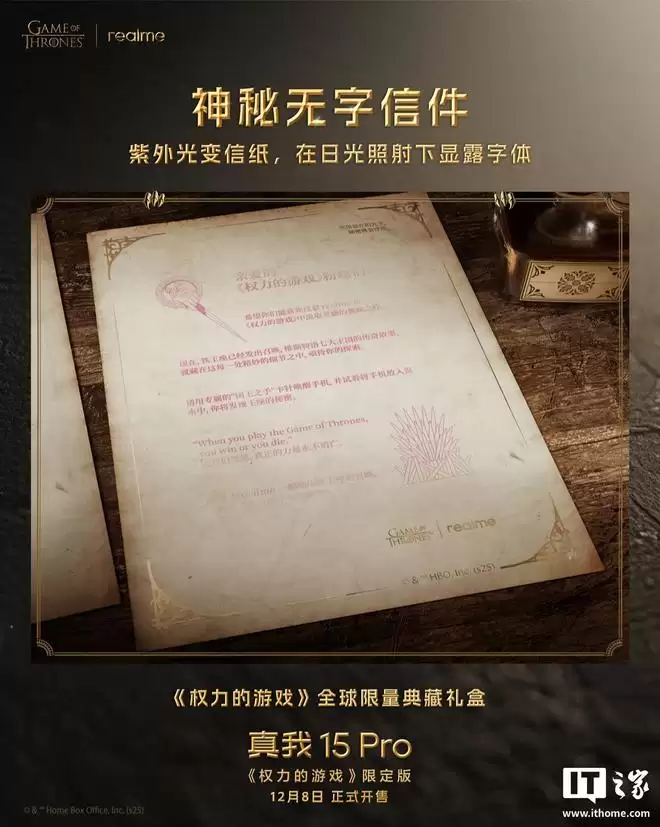 IT之家 12 月 4 日消息,真我 realme 副总裁、全球营销总裁、中国区总裁徐起今日公布了 realme 真我 15 Pro《权力的游戏》限定版典藏礼盒内容。据介绍,该限定版典藏礼盒结合经典