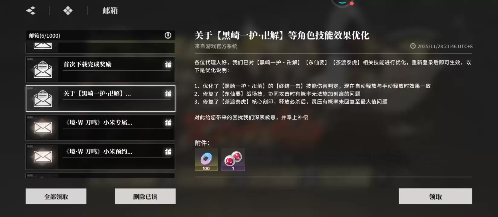 其中比较实在的一项就是优化补偿邮件,主要是针对东仙要以及黑崎一护等角色进行了平衡性调整。为了弥补玩家的体验,所以官方发放了一个随机道具,还有100个灵子——虽然数量不是很多,但也算是一份诚意,顺手领了绝对不亏。接下来是首次下载完成后的奖励,只要是刚刚注册的新玩家,都可以直接拿到100灵子。在游戏前期,这份资源显得尤为重要,无论是角色升级还是抽卡,全都用得上,简直就是白给的启动资金,开局就能少忙活半小时。