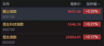 今日港股三大指数全线高开,恒生指数攀升0.17%,报25804.01点;恒生科技指数上升0.21%,国企指数上涨0.26%。盘面上,科技股走势分化:美团涨幅近1%,阿里巴巴下跌0.33%;创新药概念表现活跃,歌礼制药大涨超3%;内房股交投活跃,远洋集团上涨超1%;有色金属板块多数走高,中铝国际涨幅超过7%;航空股则开盘走低,东方航空下跌超过1%。