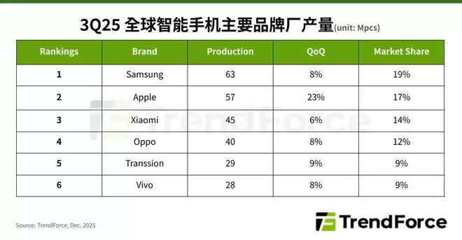 2025年Q3全球手机产量:三星环比增8%,苹果大涨23%