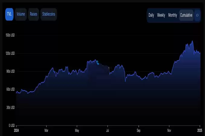 根据DeFiLlama的数据,今年DeFi的总锁仓量(TVL)已经增长了130%,达到了1,253亿美元,并在12月17日一度达到1,409亿美元,创下新高。