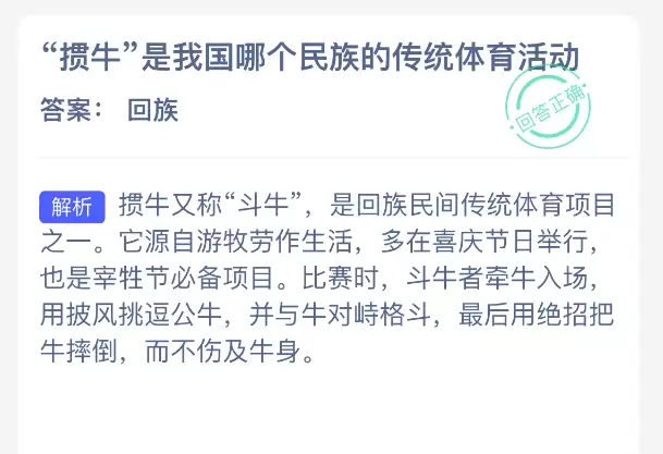大家知道“掼牛”是我国哪个民族的传统体育活动吗?【蚂蚁新村每日一题】2025年12月4日题目已公布!坚持答题,累积木兰币,就能加速小镇建设。答对本题,即刻享受“产速+3/时”的加速奖励!今日正确答案是【回族】。“掼牛”又称“斗牛”,是回族民间传统体育项目之一。