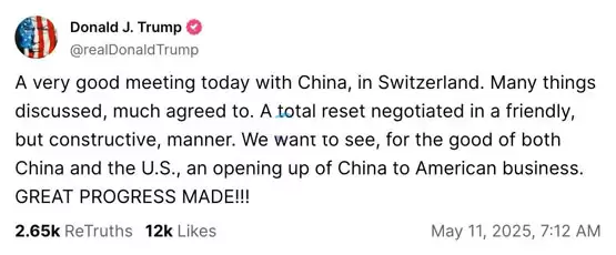 昨天,中美双方代表在瑞士日内瓦举行了关键的贸易会谈。今天早上,美国前任总统川普在社交媒体上发文,称双方取得了“重大进展”,这让原本紧张的贸易关系出现了一丝缓和的迹象。