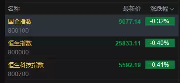 今日港股三大指数集体低开,恒指开盘下跌0.4%,恒科指跌0.41%,国企指数跌0.32%。板块方面,科网股普遍走低,腾讯跌超1%;机器人概念股延续涨势,三花智控(002050)涨幅超过1%;内房股表现活跃,碧桂园涨超1%;今日两只新股上市遇冷,遇见小面、天域半导体双双低开,其中遇见小面跌幅逾28%,天域半导体跌超34%。