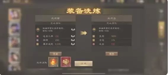 我依旧推荐先不锁词条直接洗,这样不仅省材料,还更容易出1-2条好属性。等到出现攻击、兵刃、生命(法师对应精神)等词条后,再锁定它们继续洗,争取洗出第二条优秀属性或对应的阵营加成,之后再锁定两条属性进一步优化。