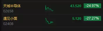 今日挂牌的两只新股表现惨淡,遇见小面大跌逾27%,天域半导体重挫超过24%。