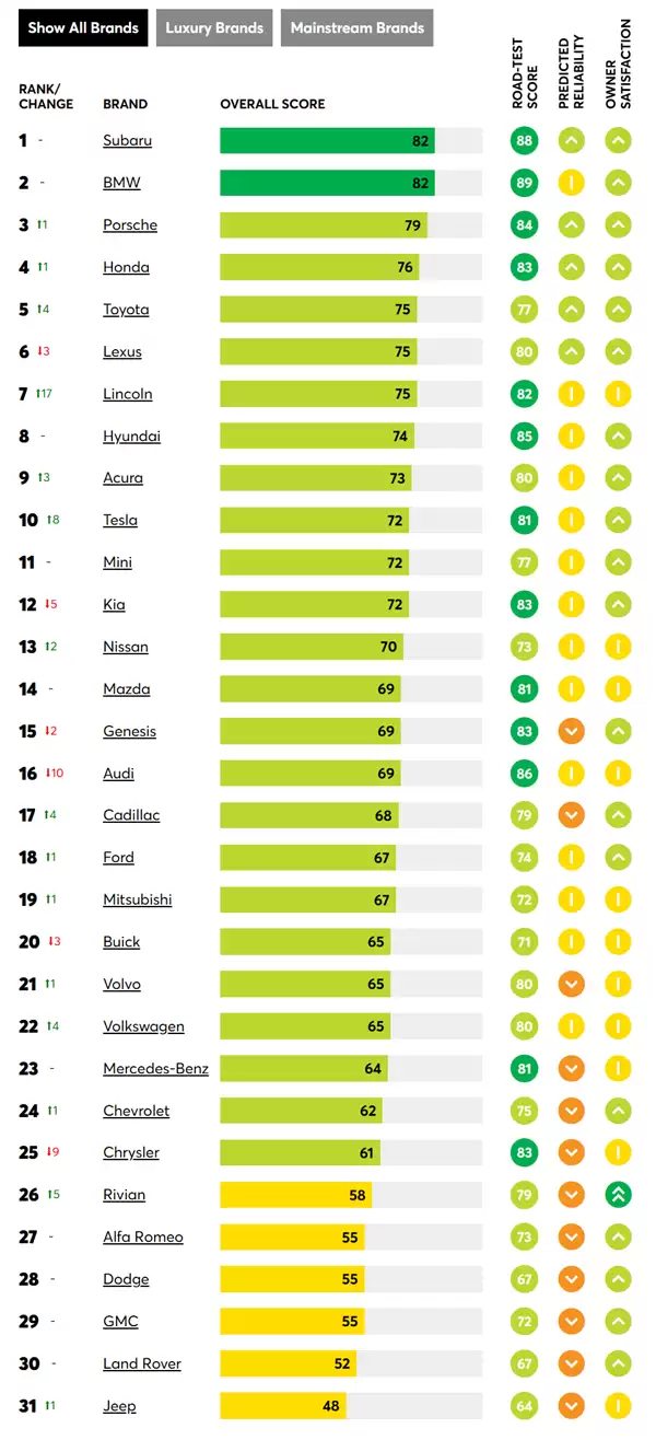 榜单末尾位置仍由Jeep、路虎、GMC占据,这三家品牌常年处于倒数三名。此外,报告明确只有在品牌拥有至少两款车型参与测试的情况下才会列入评分,因此菲亚特、英菲尼迪、捷豹、Lucid、玛莎拉蒂、Polestar与Ram等品牌未出现在此次排名中。