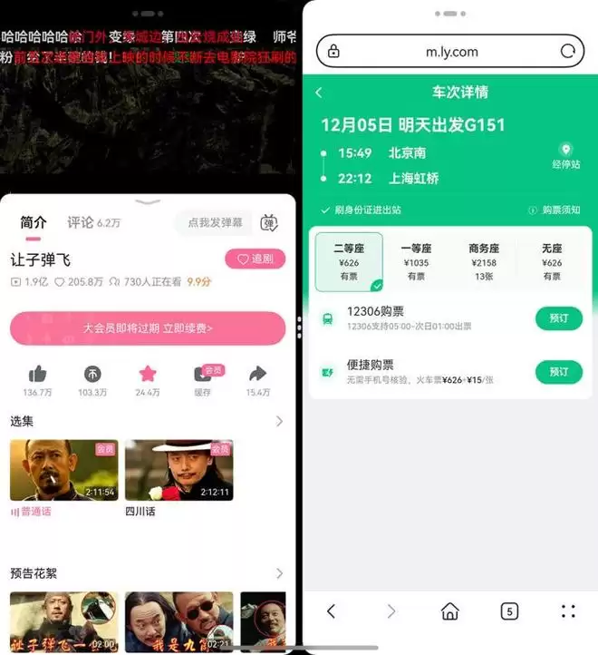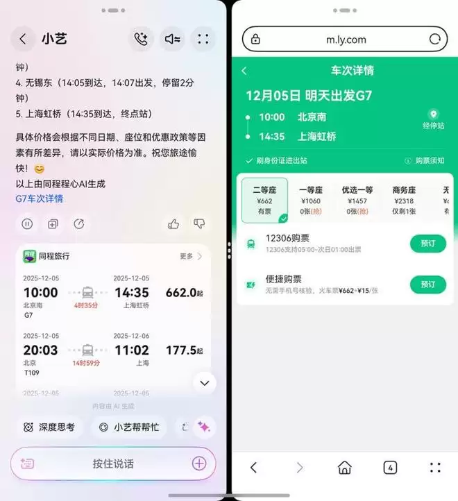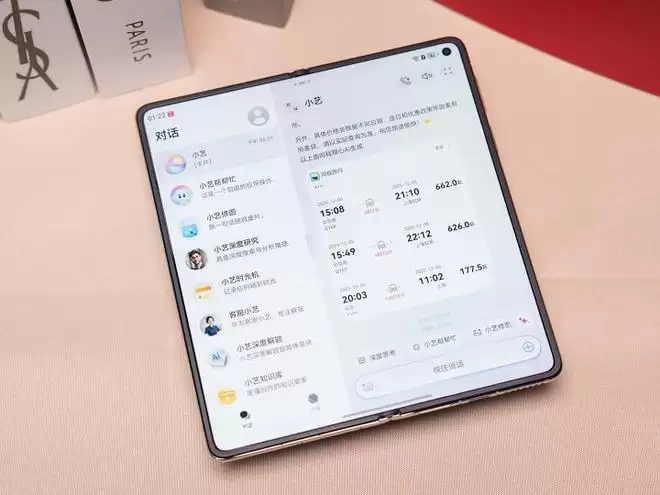 另外,在大折叠的交互逻辑下,小艺无论是查询过程还是结果呈现,都不会打扰到当下使用。比如我们看视频时查询车次,查询会通过小窗的方式进行,点击卡片后则会直接分屏呈现。