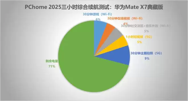续航方面,典藏版电池容量是5600毫安时,3小时续航实测,剩余电量71%,超越了今年发布的所有大折叠,这个表现就很意外了,毕竟华为电池容量并不占优。