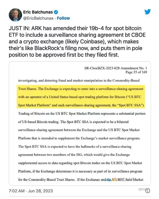 ETF.com的分析师Sumit Roy认为,额外的协议可能还不足以获得批准,特别是如果平台运营商是Coinbase(SEC本月早些时候起诉了该公司)。