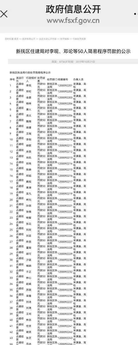 记者在新抚区政府官网查询发现,该区住建局2019年10月21日发布的《占道经营简易程序罚款公示》中,被处罚名单包含李现、金晨、胡歌、鹿晗、陈赫等50位与知名艺人同名的个人;此外,名单中还有"佟丽、林心、任贤、范冰、林志"等疑似对明星姓名进行处理后形成的内容。该公示文件此前可供查阅,截至12月5日上午,相关链接已显示"文章未找到"。