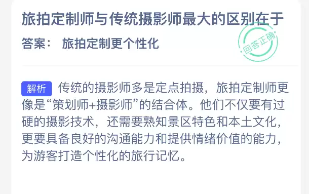 旅拍定制师和传统摄影师最大的区别是什么?【蚂蚁新村每日一题】2025年12月5日题目已发布!坚持答题,就能积累木兰币,助力加速小镇建设。答对本题,立即享受"产速+3/时"的加速奖励!今日正确答案是【旅拍定制更个性化】。