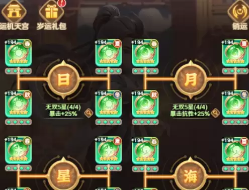天宫总共分为四个区域,分别是:日宫、月宫、星阁、海苑。每个区域掉落的岁运部位各不相同,玩家需要根据需求逐步收集同一套或者同一系列的部件。每套装备还包含春夏秋冬四种季节类型,只有凑齐相同品质、相同季节的四件套装,才能激活完整的属性效果。