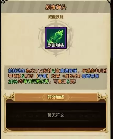 该流派以毒爆溅射和剧毒弹头为核心技能,伤害输出以普攻为主、技能为辅,搭配幽绿魅影套装带来的毒蚀元素伤害提升效果和毒蚀类技能伤害倍率加成,使得角色每次进行普攻时,都能打出相当可观的毒蚀伤害。而且该流派只需点出剧毒弹头,就能让角色在前期具备很强的战斗力,特别适合开荒,后续还能通过武器和符文搭配再次提高毒蚀伤害的上限,装备迭代也极为平滑。若各位想让自己的枪炮兵以一个极为平稳的方式过渡到后期,可选择此流派。
