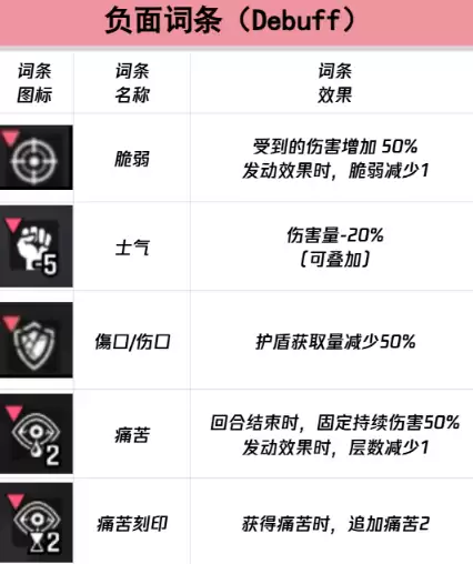 抑制输出类型的负面词条是控制敌方伤害输出的一大关键点。这类负面标签可以通过降低伤害造成效率来发挥作用,其效果可以通过叠加进行增强,且叠加规则与正面的士气词条是一致的。区别在于负面时期的特性是:回合结束后会自动清除所有叠加的层数。这意味着这一局的影响只能限于当前回合。玩家需要在词条生效的回合内,通过净化技能或规避敌方攻击的方式,来减少本方队伍的输出损失。另一个词条“削弱”同样以降低伤害为核心,但是层数的消耗会更加少量,大家可以结合实际使用。