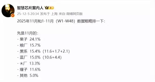 虽然目前11月份具体的旗舰销量数据尚未出炉,但相关手机品牌排名的第三方统计已经先行披露。这份数据由行业人士“智慧芯片案内人”在12月6日提供,其中显示,在刚刚过去的11月,苹果在国内市场无可争议地位列第一,整体市场份额高达24.1%。这也是苹果首次在国内连续两个月蝉联榜首,并且市场份额都稳定在四分之一左右。仅从这一点就足以看出,iPhone 17系列进入平销期后,整体表现依旧强劲,国产旗舰机型并未对其造成实质冲击,有时反而能助推iPhone 17系列的销量再创新高。不得不感叹,现实有时就是这么残酷……