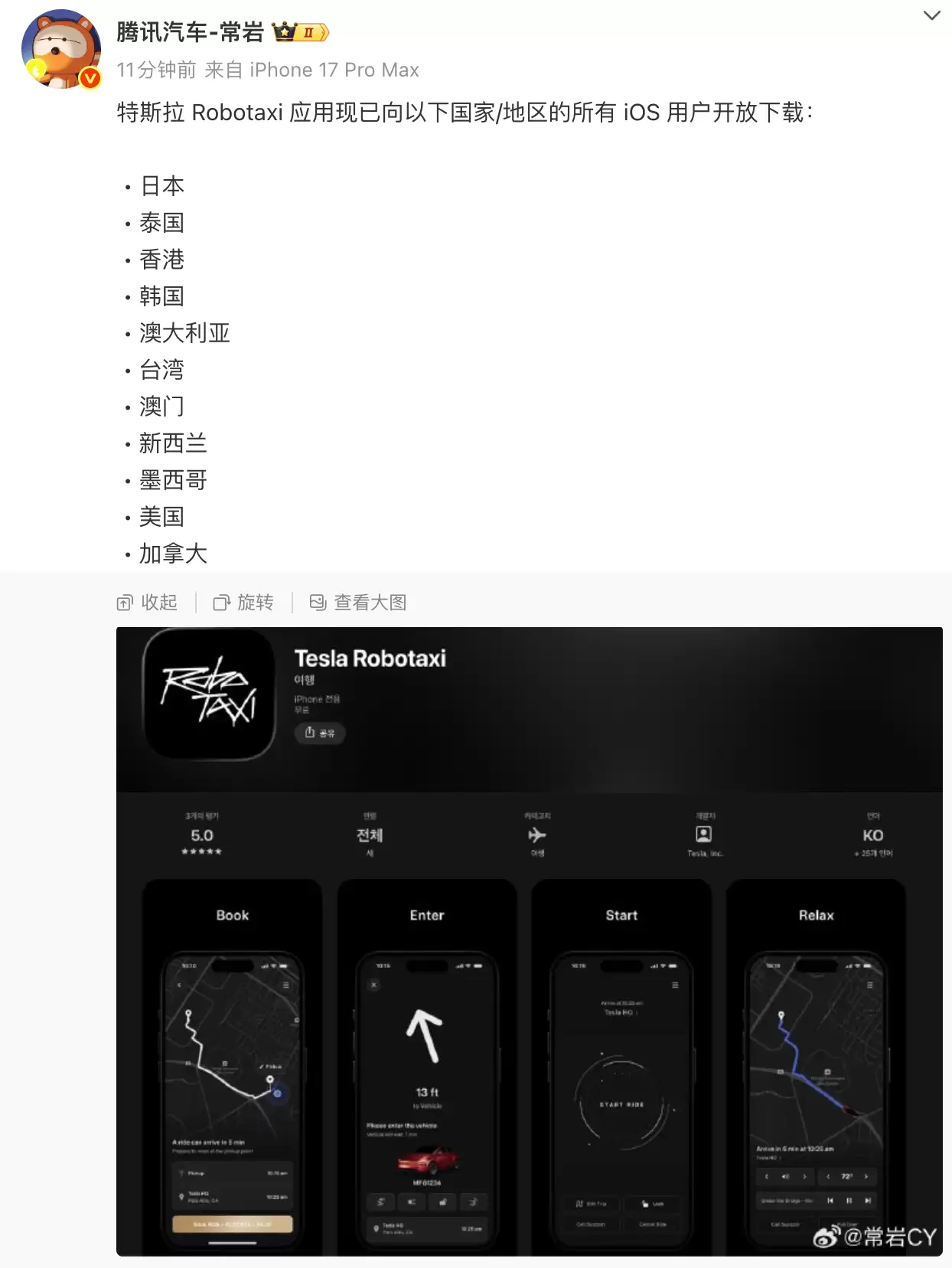 12月7日,博主@常岩CY透露,特斯拉近期在多个地区同步推进自动驾驶出行服务布局,其Robotaxi应用现已面向美国、日本、泰国、韩国、澳大利亚等八个国家以及中国港澳台地区的所有iOS用户开放下载。