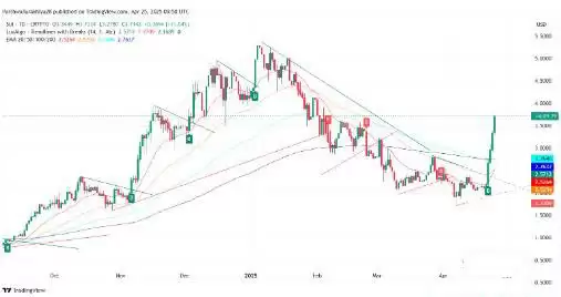 第二季度以突破下降楔形形态的爆发式增长开局。价格干净利落地突破了 2.75 美元至 2.80 美元附近的 100 和 200 日移动平均线,并飙升至 3.00 美元的心理关口上方。图表显示,在 MACD 上行和布林带扩张的支撑下,形成了强劲的看涨吞没 K 线。RSI 飙升至 70,表明买盘势头强劲。4 月底对 3.80 美元的重新测试将之前的阻力位转化为支撑位。如果势头持续,本季度可能会出现反弹,目标价位在 5.00 美元至 5.30 美元之间,尤其是在山寨币市场整体保持看涨的情况下。4.30 美元附近可能会出现小幅盘整区域。