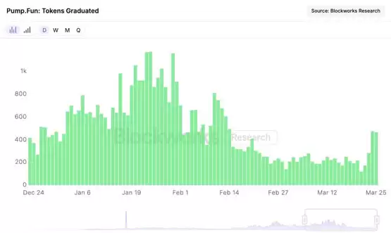 PumpSwap 上线后,每天成功发行的代币数量最多达到 500 个,虽然还没回到 1 月份每天近 1000 个的峰值,但已经呈现回升趋势。