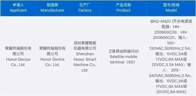 除此之外,一款型号为 BKQ-AN20 的荣耀新机在近日通过 3C 认证,配有120W快充头,是一款“卫星移动终端(5G)”。