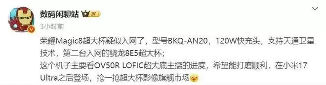 博主@数码闲聊站 表示,这款新机疑似为荣耀 Magic8 超大杯,支持天通卫星技术,是第二台入网的骁龙 8E5 超大杯。这个机子主要看 OV50R LOFIC 超大底主摄的进度,在小米 17 Ultra 之后登场,抢一抢超大杯影像旗舰市场。