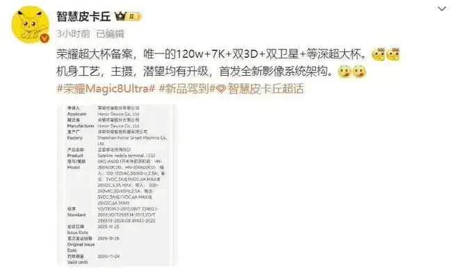 另据博主@智慧皮卡丘 爆料,荣耀超大杯备案,唯一的 120w+7K+ 双 3D+ 双卫星 + 等深超大杯。机身工艺,主摄,潜望均有升级,首发全新影像系统架构。