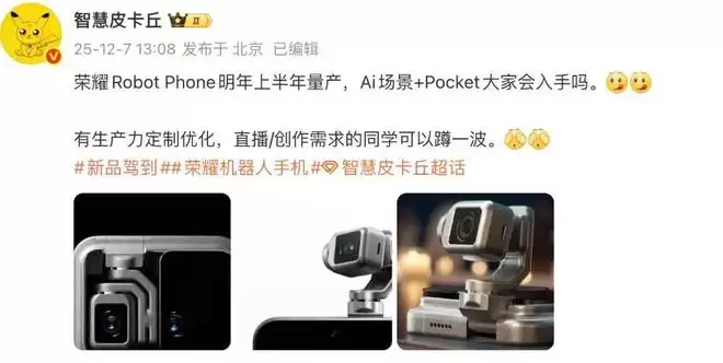 今天,博主@智慧皮卡丘 的一份消息中提到,“荣耀Robot Phone明年上半年量产,Ai场景+Pocket大家会入手吗。有生产力定制优化,直播/创作需求的同学可以蹲一波。”