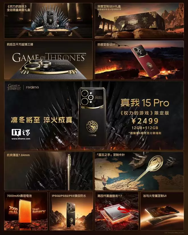 IT之家12月8日报道,realme真我15Pro《权力的游戏》联名限定版手机今天正式开售,仅提供12GB+512GB一个版本,售价2499元。