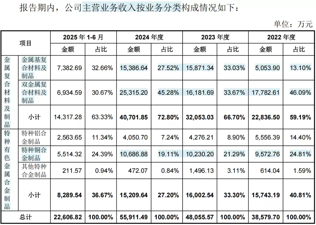 公司主营业务为金属复合材料及制品、特种有色金属合金制品的研发、生产与销售。2024年度,公司实现营业收入6.10亿元,扣非后归母净利润为0.55亿元。