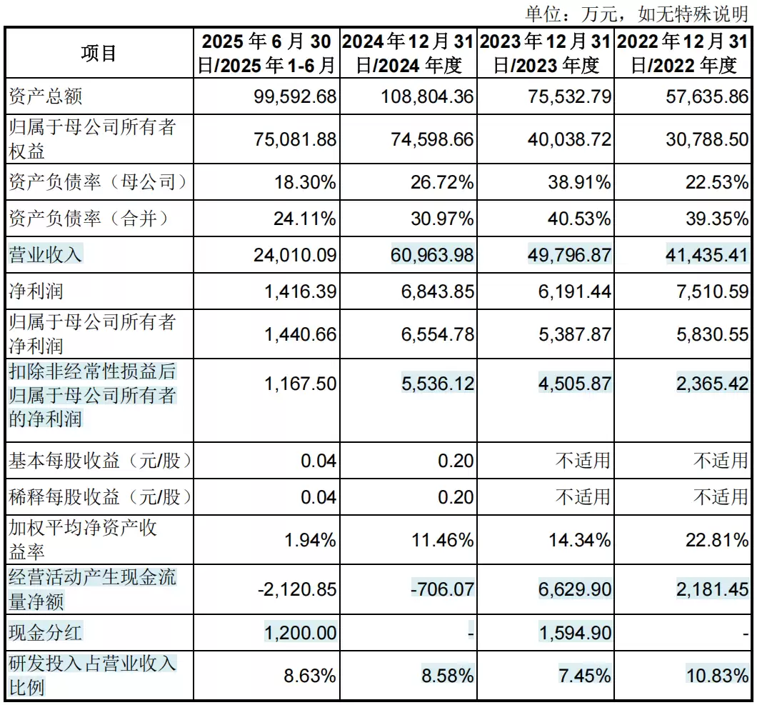 回看过去三年业绩,公司保持着稳定的增长势头。2022年至2024年,公司营业收入分别为4.14亿元、4.98亿元和6.10亿元,年复合增长率约20%;同期扣非后归母净利润分别为0.24亿元、0.45亿元和0.55亿元。