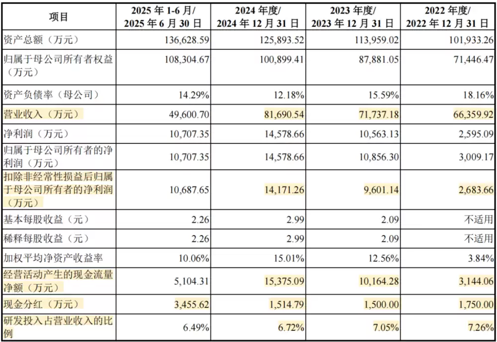 2023年至2025年,公司业绩保持快速增长态势。营业收入分别为6.64亿元、7.17亿元和8.17亿元,同期扣非后归母净利润分别为0.27亿元、0.96亿元和1.42亿元。2025年上半年,公司营业收入和扣非净利润分别达到4.96亿元和1.07亿元,同比增幅分别为30%和48%。