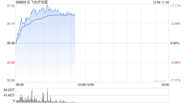长飞光纤光缆(6869 HK)低开高走,盘中一度涨至8%,现报39 8港元,总市值超300亿港元。消息上,长飞光纤光缆股份有限公司将通过以每股32 26港元的价格配售7000万股新股筹集约22 3亿
