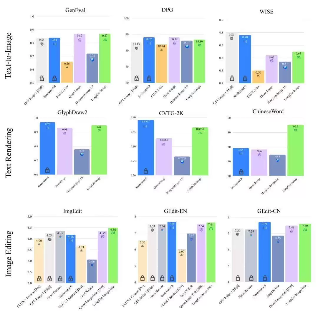 1. 在图像编辑基准测试GEdit-Bench和ImgEdit-Bench中,LongCat-Image得分分别为中英文综合7.60/7.64分以及专项4.50分,均达到了开源模型中的领先水平。