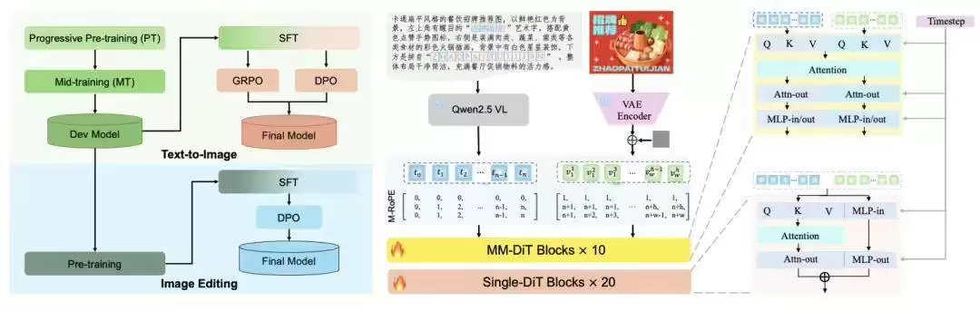 根据介绍,LongCat-Image采用了图文生成与图像编辑同源的混合骨干架构(MM-DiT+Single-DiT),并整合了视觉语言模型条件编码器。它的核心技术创新点主要包括: