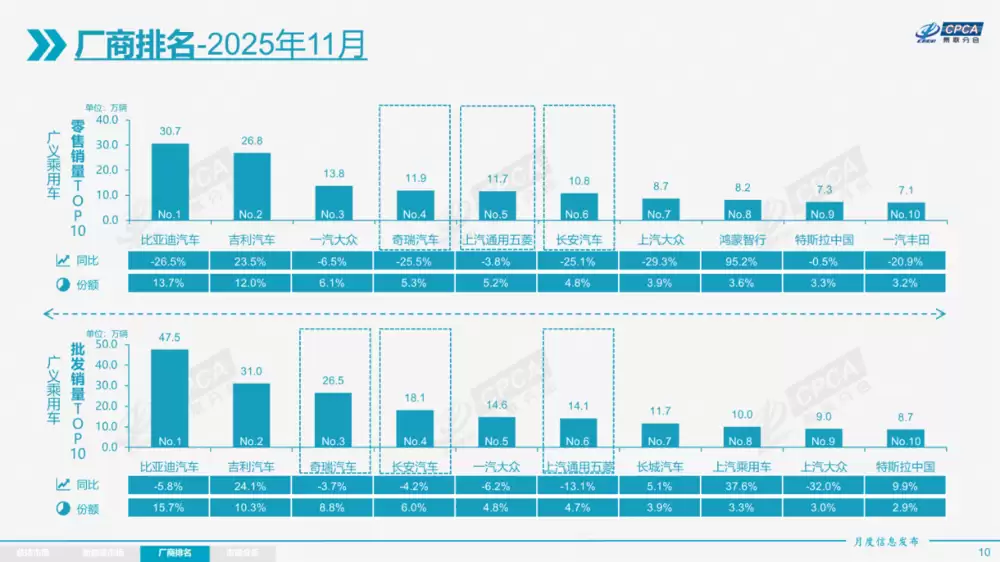 纵观全年国内车市零售增速走势,呈现出明显的“前低中高后平”特征:1-2月同比增长1.2%,3-6月增幅扩大至15%,7-9月增速在6%左右徘徊,而10-11月则回落至偏低水平。这反映出在四季度高基数效应下,市场增长节奏放缓,基本符合年初的预期判断。