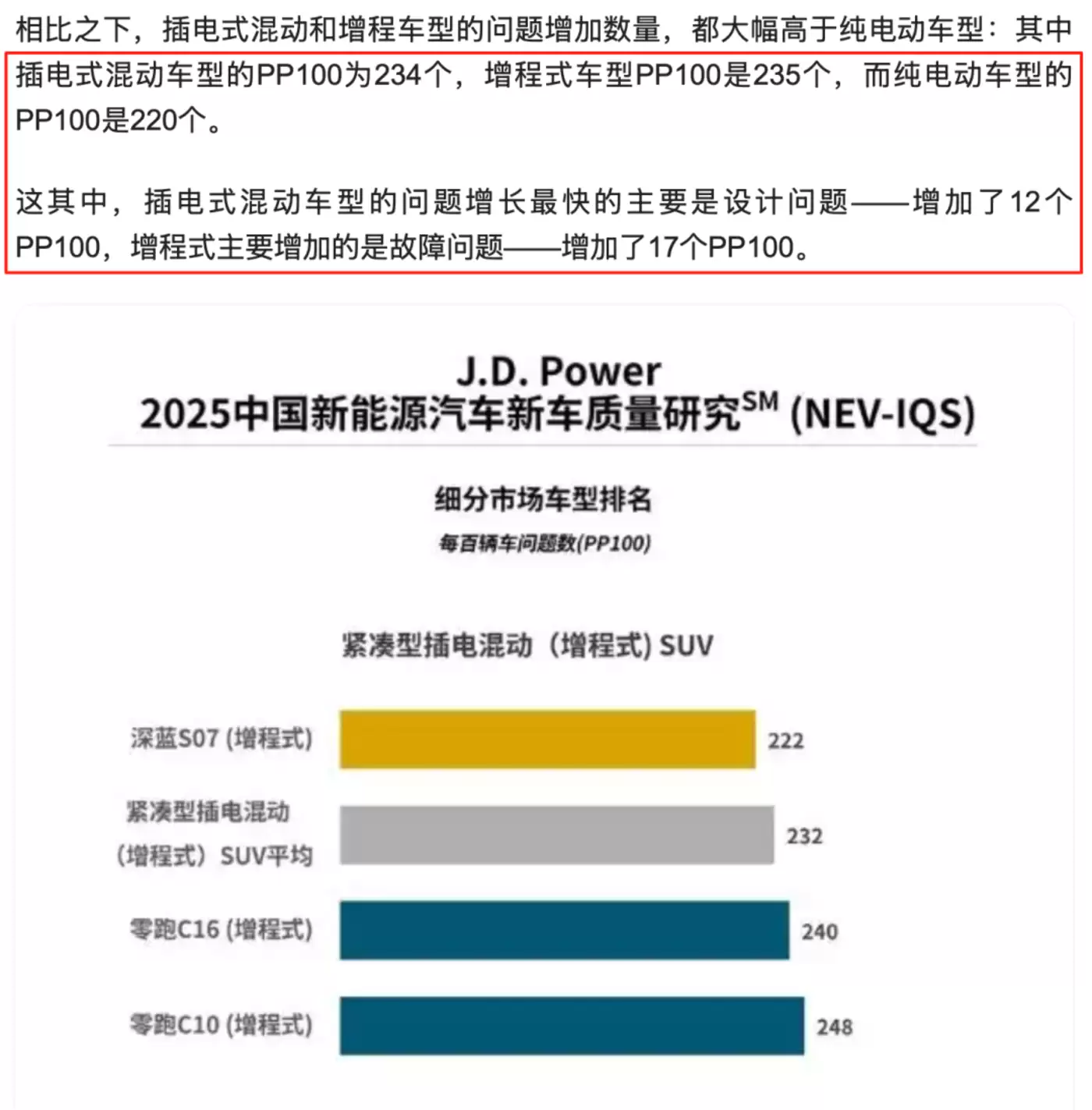 J.D.Power 2025年新车质量研究显示,插电式混动和增程车型的问题增加数量,都大幅高于纯电动车型:其中插电式混动车型的PP100(每百辆车问题数)为234个,增程式车型PP100是235个,而纯电动车型的PP100是220个。这其中,插电式混动车型的问题增长最快的主要是设计问题——增加了12个PP100,增程式主要增加的是故障问题——增加了17个PP100。