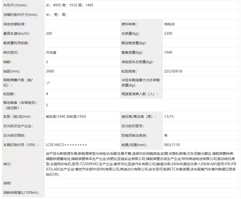 动力方面,该车将搭载由南京市比亚迪汽车有限公司生产的驱动电机,其型号为TZ200XYAT,最大功率为240千瓦。电池部分,新车将搭载由郑州弗迪电池有限公司生产的磷酸铁锂蓄电池组。