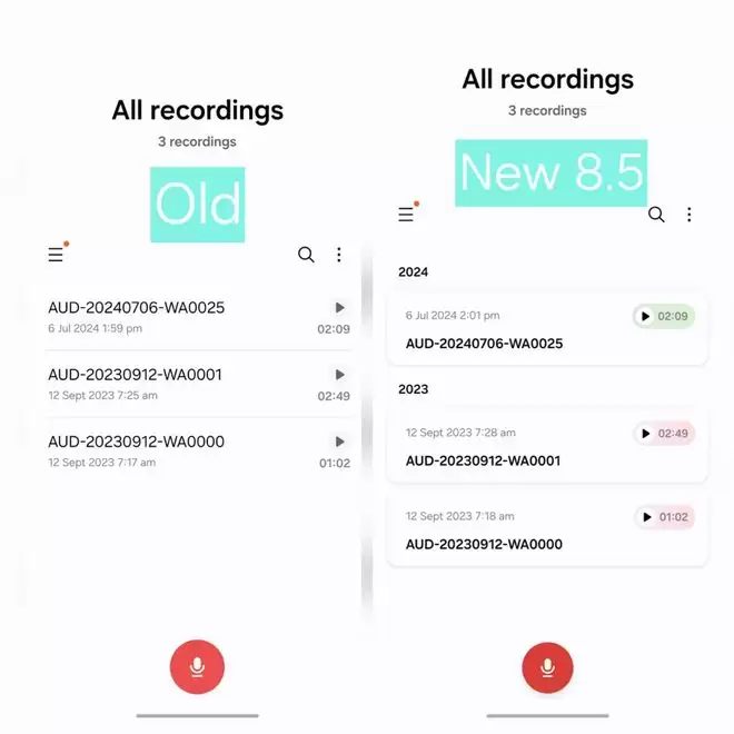 录音机文件列表页的改版在追求美观的同时也引发了争议。新版 UI 摒弃了传统的紧凑列表视图,转而采用大尺寸的卡片式设计,并为录音时长添加了颜色标识。