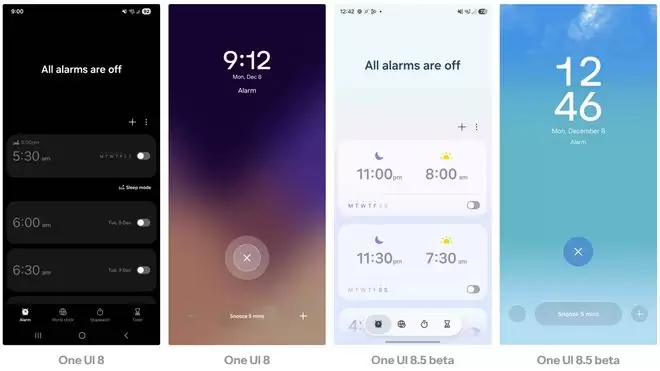根据 One UI 8.5 测试版的更新日志,时钟应用现在能够调取实时天气数据,并将其直接渲染为闹钟背景。
