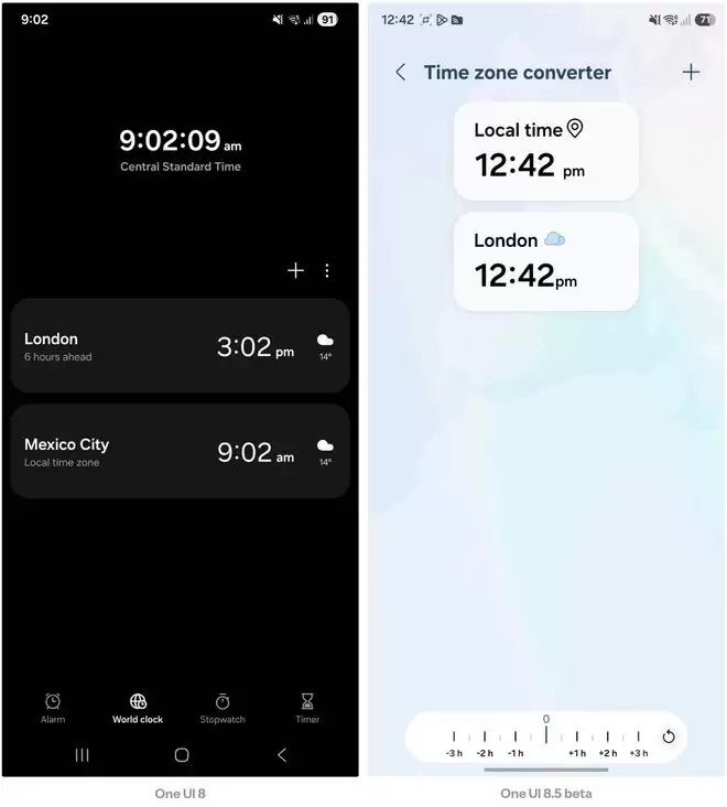 新版还改进了世界时钟功能。三星在界面底部新增了一个“时区转换滑块(Time-zone converter slider)”。