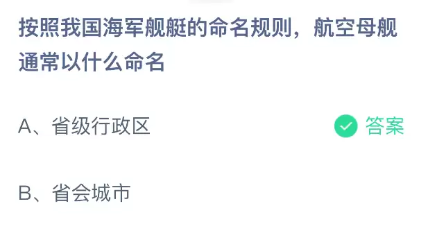 根据我国海军舰艇的命名规则,航空母舰通常以什么来命名?支付宝小鸡课堂开课啦!每天花一分钟答题赚饲料,喂喂小鸡就能贡献爱心,轻松又充满意义!2025年12月9日蚂蚁庄园的课堂题目正确答案是【省级行政区】,根据我国海军舰艇的命名规则,航空母舰通常以省级行政区划名称来命名。