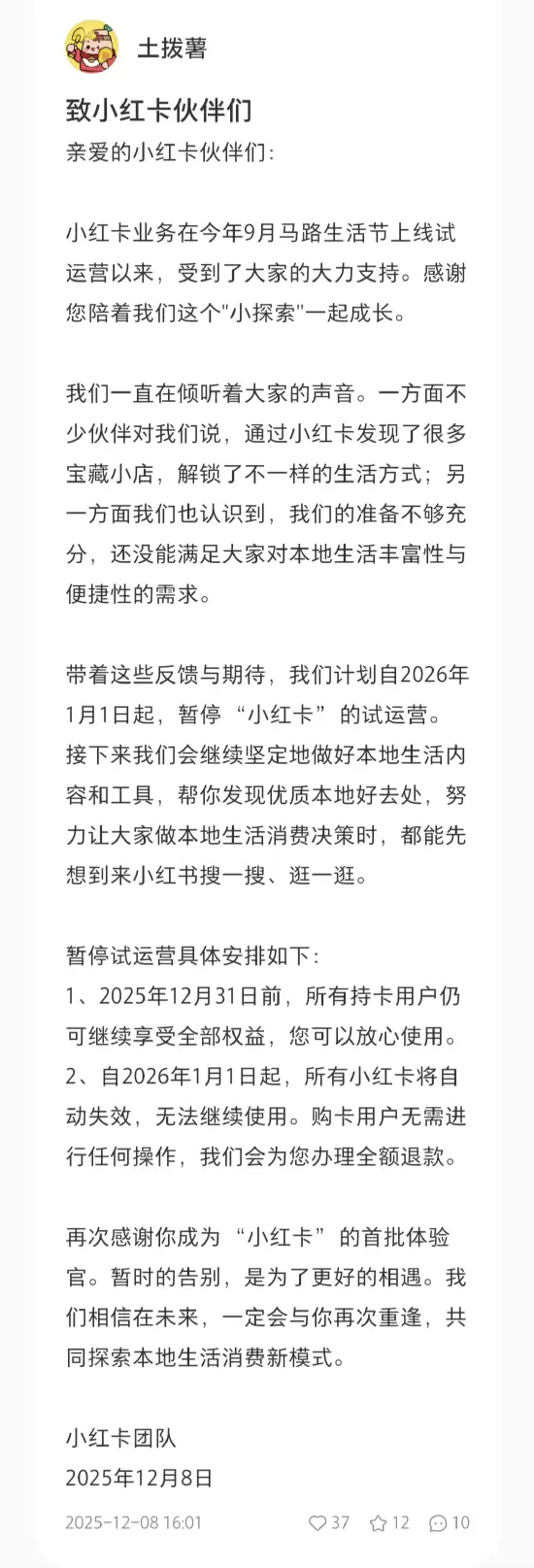 小红书方面表示:“自今年9月马路生活节上线试运营以来,小红卡业务得到了大家的热烈支持。感谢您陪伴我们一起成长,共同经历了这段‘小探索’。我们一直认真倾听着每一位用户的声音。一方面,许多伙伴告诉我们,通过小红卡他们发现了不少宝藏小店,解锁了别具特色的生活方式;另一方面,我们也清醒地认识到,目前的准备工作尚有不足,暂时还无法完全满足大家对本地生活丰富性与便捷性的期待。”