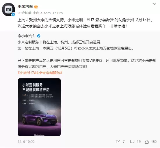 小米汽车日前在官方微博发布消息,其线下定制服务将于上海、杭州、成都三城同步开启巡展。其中,上海站YU7+紫水晶车型的展出时间将额外延长至12月14日。