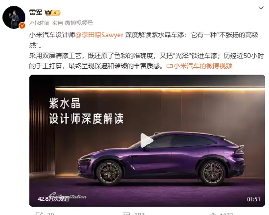 雷军今日转发了小米汽车设计师田原对于紫水晶车漆的解读,称其营造出一种“不张扬的高级感”。该车漆采用了双层清漆工艺,不仅精准还原了色彩的纯度,更将温润的“光泽感”牢牢锁进漆面,历经近50小时的手工打磨,最终呈现出深邃且璀璨的丰富质感。